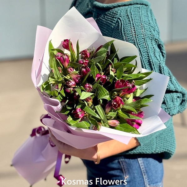 Цветочная композиция из альстромерий упакована в два слоя пленки с гладкой и рельефной текстурой. Растения зафиксированы атласной лентой лавандового оттенка.