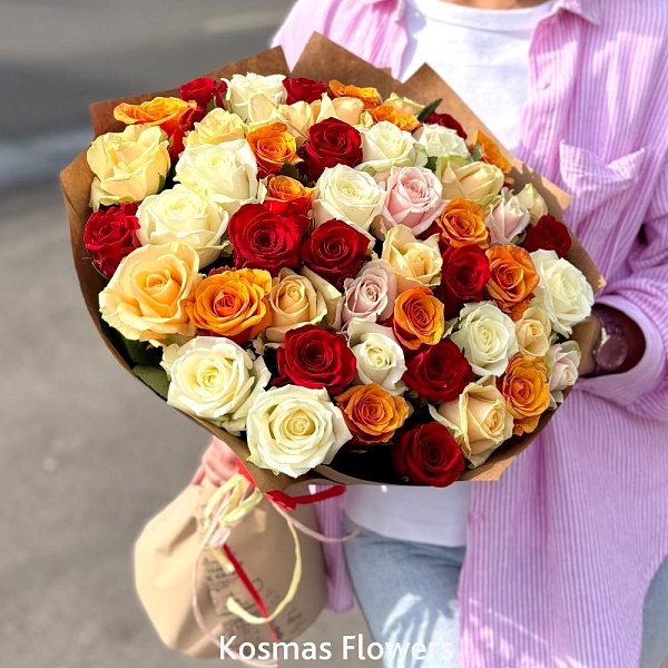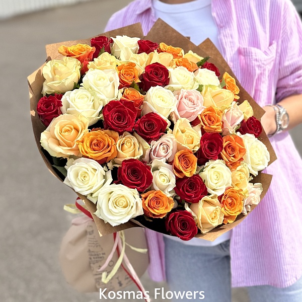 Пятьдесят одна роза в этом букете — это не просто цветы, а целая симфония красок и настроений. Кремовые бутоны, словно облака на рассвете, дарят нежность и спокойствие. Желтые розы, яркие, как солнечные блики, наполняют композицию теплом и оптимизмом. Розовые лепестки, напоминающие румянец влюбленных, добавляют ноту романтики, а глубокий бордовый, как бархатная ночь, вносит таинственность и страсть.